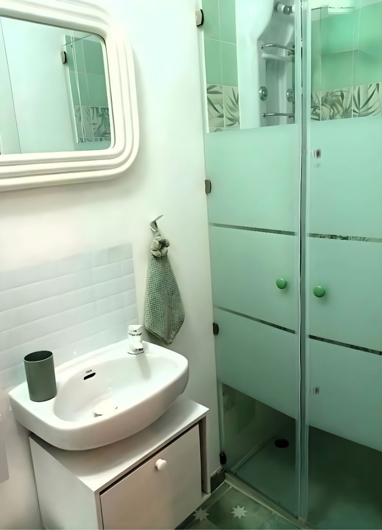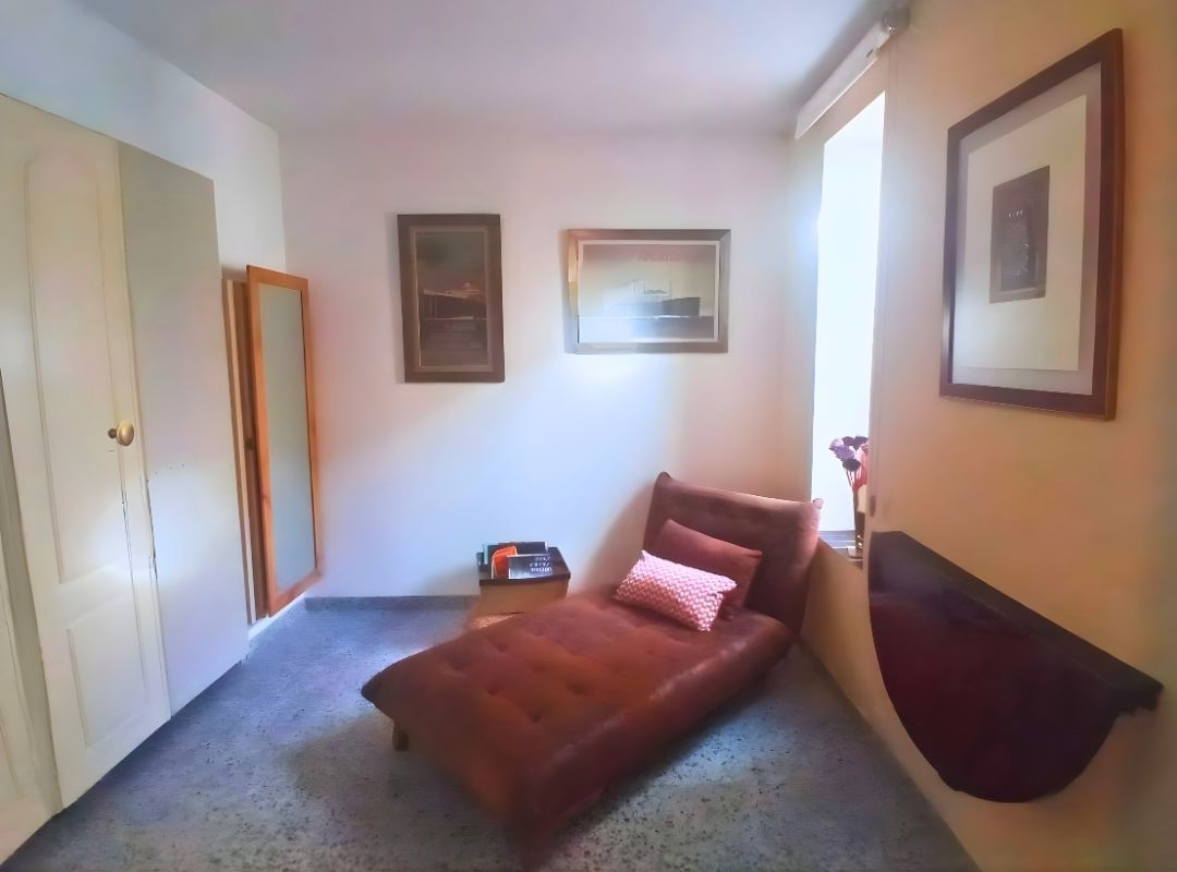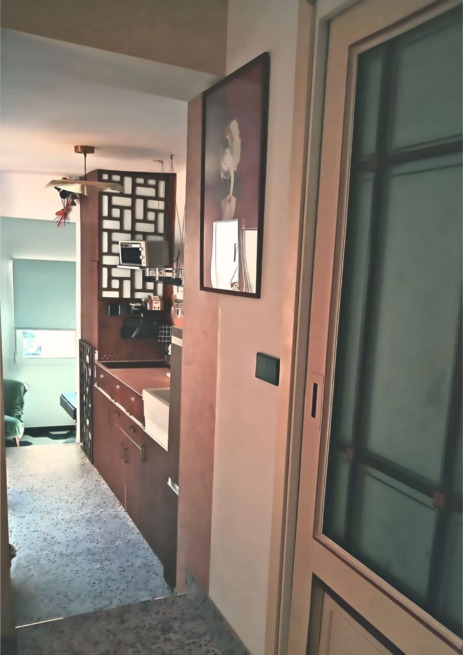 Small house of 50m2, consisting of a living room, a kitchen, a shower room, a work or reading room, a bedroom, and a central private patio of 6m2.